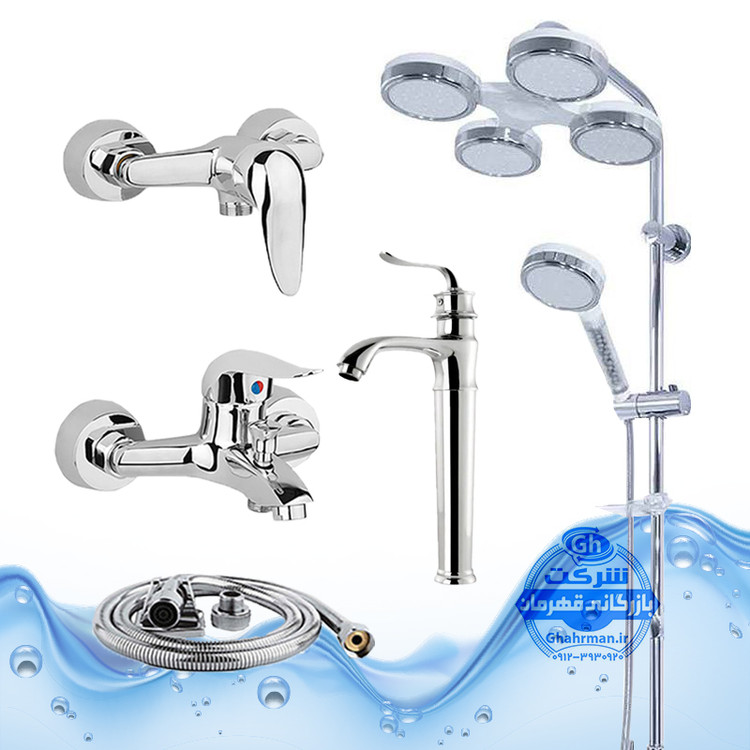 ست ۵ عددی شیرآلات مدل دنیز | روشویی پایهبلند + توالت + حمام + علم دوش هلی شاتی + شلنگ توالت | کروم براق