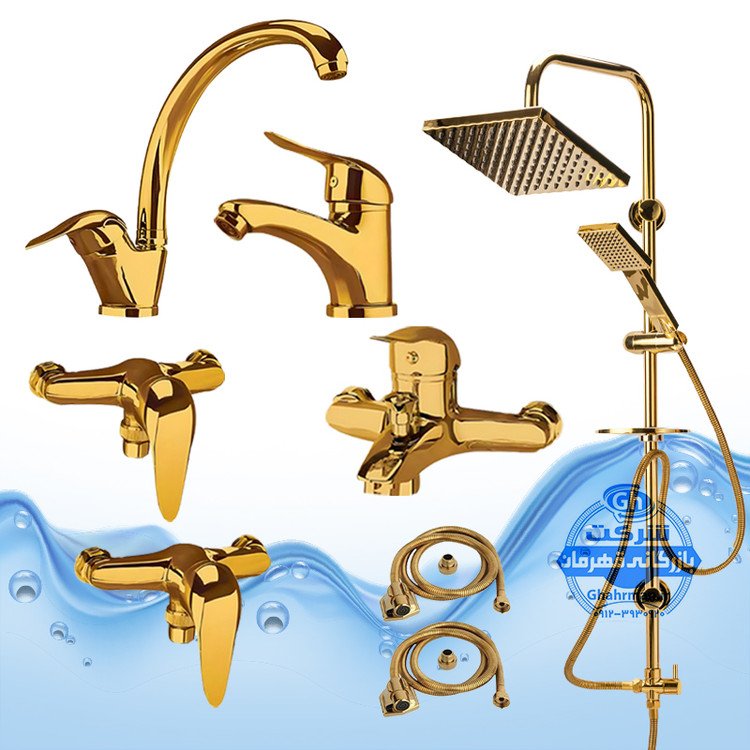 ست ۸ عددی شیرآلات برند آیدا صنعت مدل قهرمان اردکی | شیر ظرفشویی + روشویی + حمام + دو عدد توالت + علم دوش یونیورست صفحه استیل رسوبگیر اتومات + دو شلنگ توالت | طلایی براق