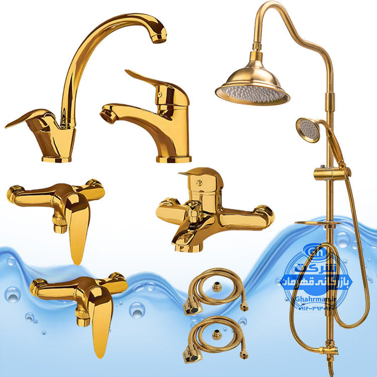 ست ۸ عددی شیرآلات برند آیدا صنعت مدل دنیز | شیر ظرفشویی + روشویی + حمام + دو عدد توالت + علم دوش یونیورست شیپوری + دو شلنگ توالت | طلایی براق