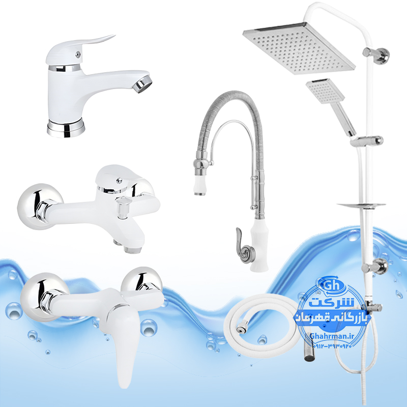 ست ۶ عددی شیرآلات برند آیدا صنعت مدل دنیز | سفید کروم براق | علم دوش رسوبگیر | ظرفشویی بامبو فنری