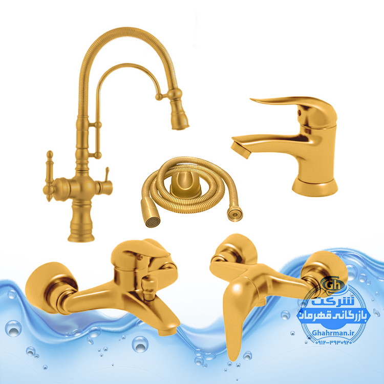 ست ۵ عددی شیرآلات برند آیدا صنعت مدل دنیز | شیر روشویی + شیر ظرفشویی بیزانس دومنظوره + شیر توالت + شیر حمام + شلنگ توالت | طلایی مات