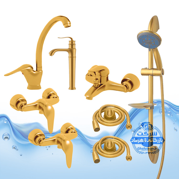 ست ۸ عددی شیرآلات برند آیدا صنعت مدل دنیز | شیر ظرفشویی + روشویی پایهبلند + حمام + دو عدد توالت + علم دوش یونیکا متحرک ضد رسوب + دو شلنگ توالت | طلایی مات