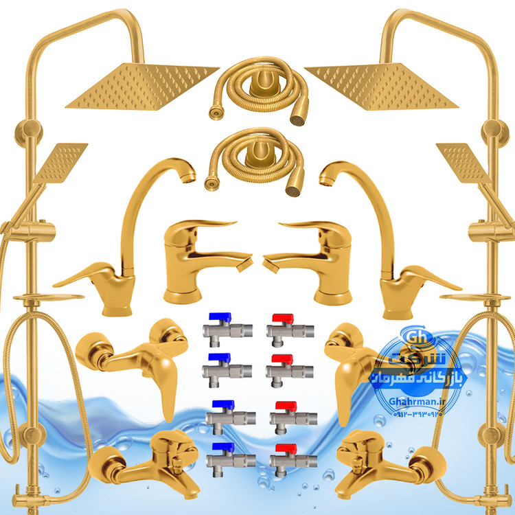 ست ۲۰ عددی شیرآلات برند آیدا صنعت مدل دنیز | دو عدد شیر ظرفشویی + دو عدد شیر روشویی + دو عدد شیر حمام + دو عدد شیر توالت + دو عدد علم دوش یونیورست مدل صفحه استیل مربع + دو عدد شلنگ توالت + دو عدد شلنگ استیل + هشت عدد شیر پیسوار | طلایی مات