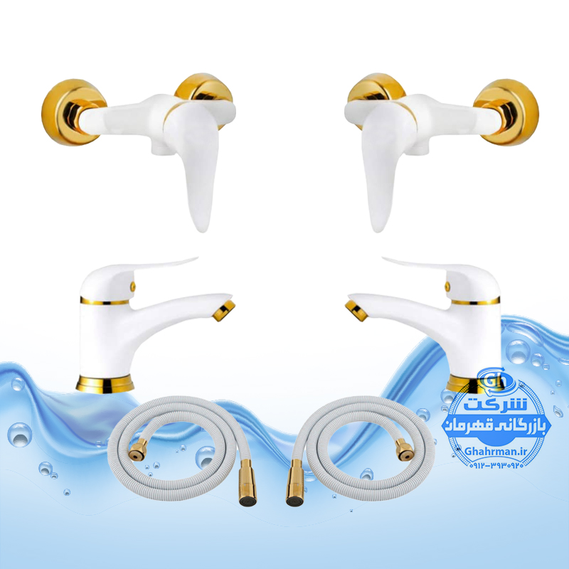 ست ۶ عددی شیرآلات مدل دنیز | ۲ عدد شیر روشویی + ۲ عدد شیر توالت + ۲ عدد شلنگ توالت | سفید طلایی