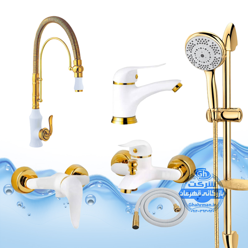 ست ۶ عددی شیرآلات برند آیدا صنعت مدل دنیز | سفید طلایی | ظرفشویی فنری بامبو + علم دوش یونیکا