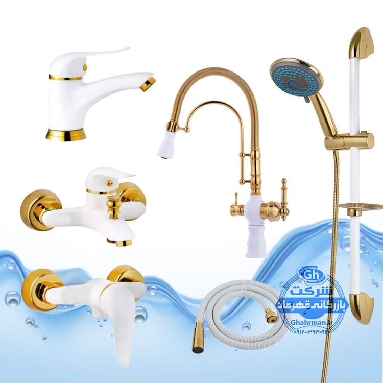 ست ۶ عددی شیرآلات برند آیدا صنعت مدل دنیز | شیر ظرفشویی بیزانس دومنظوره + روشویی + حمام + توالت + علم دوش یونیکا + شلنگ توالت | سفید طلایی