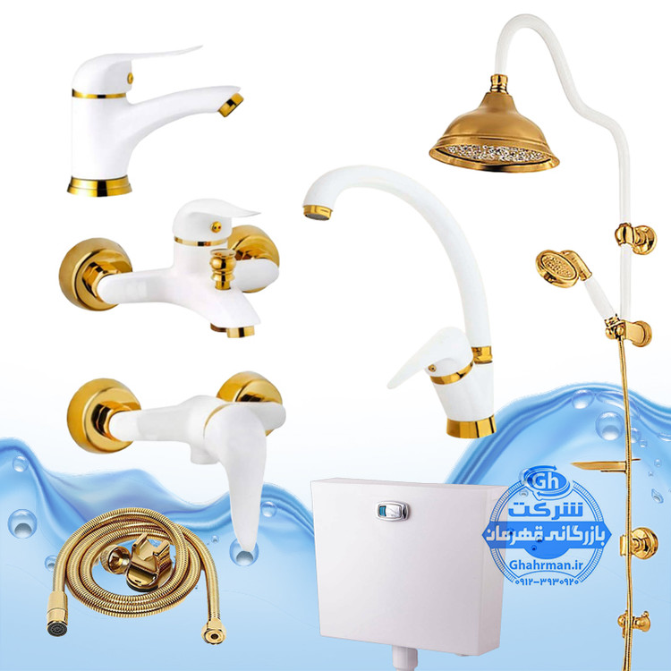 ست ۷ عددی شیرآلات برند آیدا صنعت مدل دنیز | سفید طلایی | همراه علم دوش شیپوری