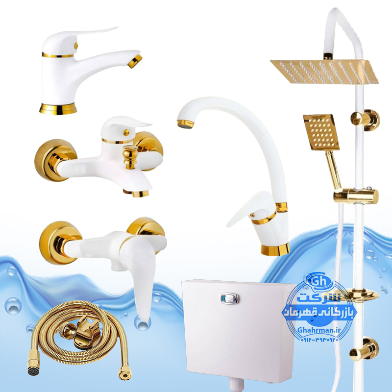 ست ۷ عددی شیرآلات برند آیدا صنعت مدل دنیز | سفید طلایی | علم دوش صفحه استیل