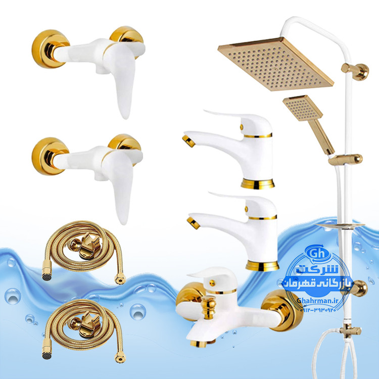 ست ۸ عددی شیرآلات برند آیدا صنعت مدل دنیز | شیر حمام + دو عدد توالت + دو عدد روشویی + علم دوش یونیورست صفحه استیل رسوبگیر اتومات + دو شلنگ توالت | سفید طلایی