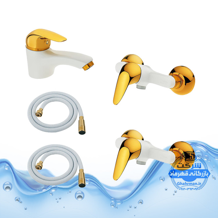 ست ۵ عددی شیرآلات برند آیدا صنعت مدل قهرمان | ۲ عدد شیر توالت + شیر روشویی + ۲ عدد شلنگ توالت | سفید طلایی